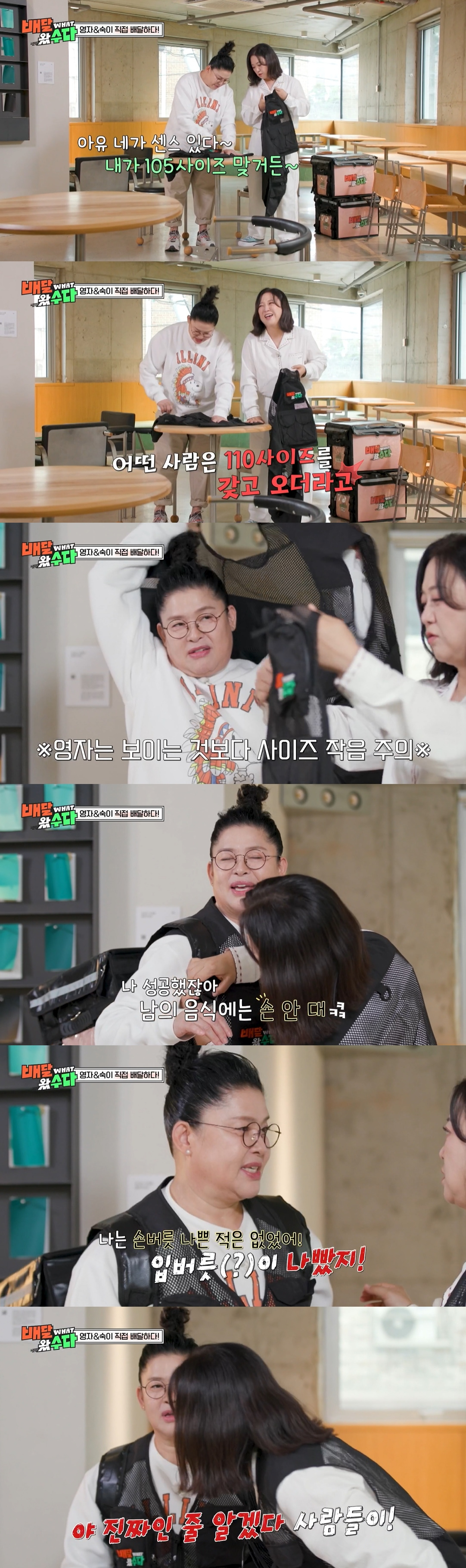 이날 이영자는 첫 배달에 앞서 김숙이 준비한 옷을 보자마자 "아유 네가 센스 있다. 내가 105만 맞아. 어떤 사람은 110 사이즈를 갖고 오더라고"라며 너스레를 떨었다. 이에 김숙은 "장난치냐. 언니 105지. 110은 아니지. 언니 왜 이렇게 잘 어울려?"라며 이영자의 옷 사이즈를 언급했고, 이영자는 "안정감 있지"라며 만족해했다.