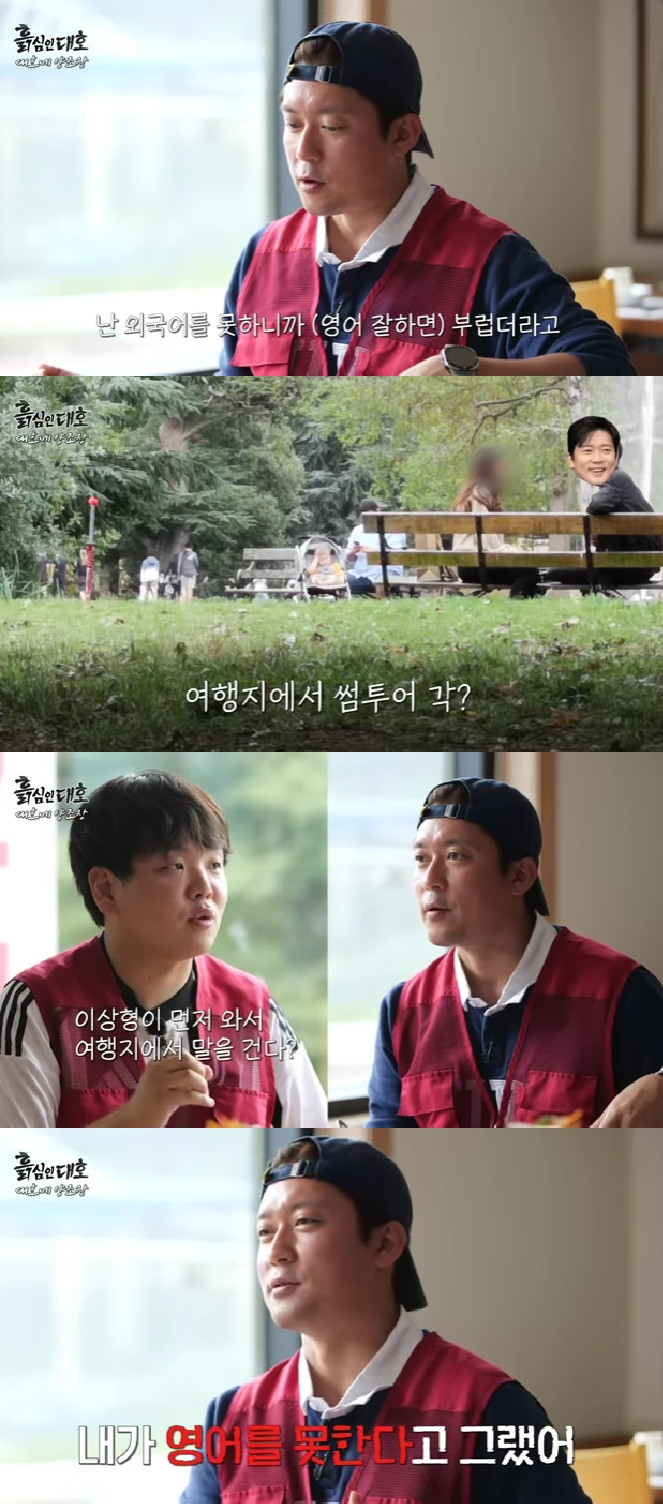 김대호는 "난 외국어를 못하니까 영어 잘하면 부럽더라. 내가 후회되는 게 벤치가 두 개 있었는데 다른 벤치에 너무 예쁜 여성분이 앉아있더라. 근데 심지어 나한테 먼저 와서 뭘 물어봤다"고 일화를 전했다.