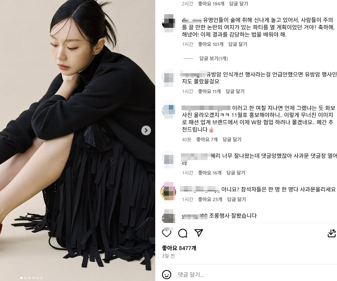 그럼에도 입을 굳게 다물었던 W코리아. 마침내 19일 이들은 긴 침묵을 깨고 공식 인스타그램 계정에 사과문을 게재했다. W코리아는 "10월 15일 행사는 캠페인 취지에 비추어 볼 때 구성과 진행이 적절치 않았다는 지적이 있었고, 저희는 이를 무겁게 받아들이고 있다. 무엇보다, 유방암 환우 및 가족분들의 입장을 세심하게 고려하지 못하여 불편함과 상처를 드리게 된 점에 대해 깊은 사과의 말씀을 올린다"라고 고개를 숙였다.
