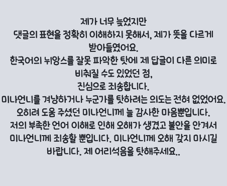 박수지는 "너무 늦었지만 댓글의 표현을 정확히 이해하지 못해서 뜻을 다르게 받아들였다. 한국어의 뉘앙스를 잘못 파악한 탓에 제 답글이 다른 의미로 비쳐질 수 있었던 점 진심으로 죄송하다"라며 "미나 언니를 겨냥하거나 누군가를 탓하려는 의도는 전혀 없었고 도움 주셨던 미나 언니께 늘 감사한 마음"이라고 강조했다.