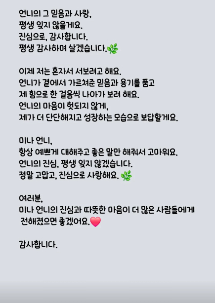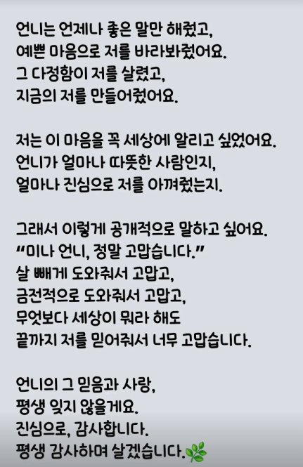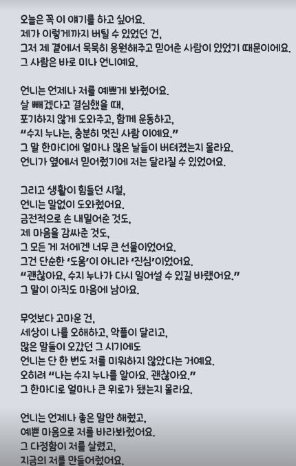 이어 "미나 언니는 그저 제 곁에서 묵묵히 응원해주고 믿어준 사람"이라며 "생활이 힘들던 시절에도 말없이 도와줬고 금전적으로 손 내밀어준 것도, 제 마음을 감싸준 것도 너무 큰 선물이었다"라고 말을 이었다.