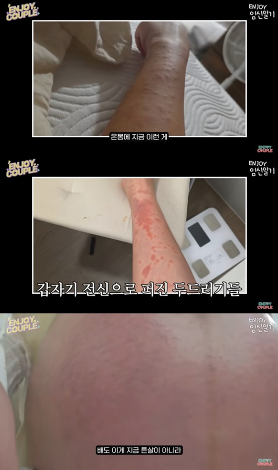 출산 4일 전 임라라는 "하루아침에 갑자기 (두드러기가) 온몸에 퍼졌다"며 온몸에 퍼진 두드러기를 공개했다. 그는 빨개진 배도 공개하며 "병원에 문의해놨는데 배도 튼살이 아니고 소양증"이라고 말했다.