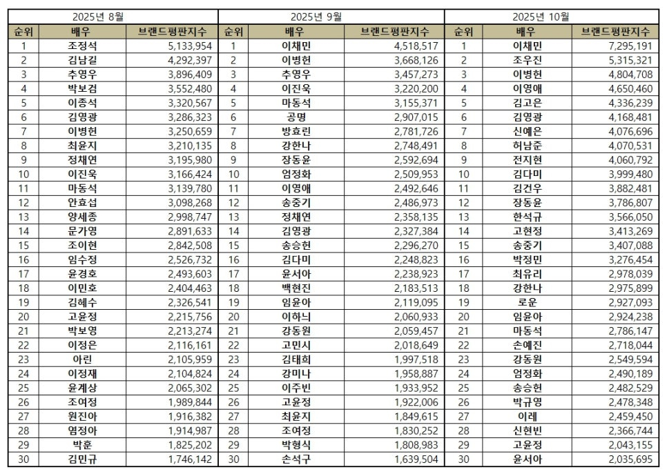 2025년 10월 배우 브랜드평판 30위 순위는 이채민, 조우진, 이병헌, 이영애, 김고은, 김영광, 신예은, 허남준, 전지현, 김다미, 김건우, 장동윤, 한석규, 고현정, 송중기, 박정민, 최유리, 강한나, 로운, 임윤아, 마동석, 손예진, 강동원, 엄정화, 송승헌, 박규영, 이레, 신현빈, 고윤정, 윤서아 순이었다.