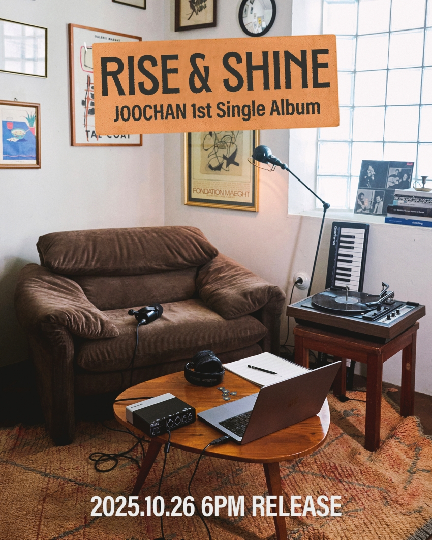 쇼파와 테이블, 러그 등 차분한 브라운 톤으로 꾸며진 공간은 가을 분위기를 물씬 자아냈다. 여기에 곡명 '라이즈 앤 샤인', 발매일시인 '2025.10.26', '6PM' 등이 함께 새겨져 있어 기대감을 더욱 상승시켰다.