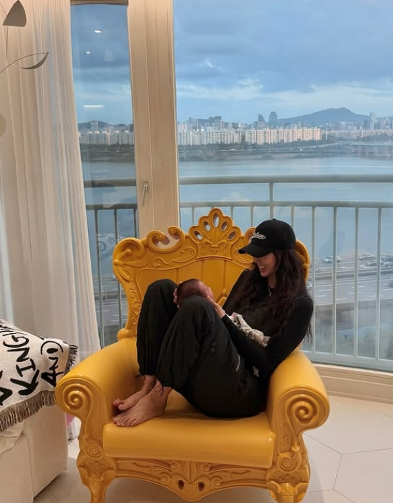 공개된 사진에는 쌍둥이 출산 이후으로 집으로 돌아온 지소연의 모습이 담겨 있다. 사진 속 지소연은 한강이 보이는 자택에서 소파 위에 앉아 갓 태어난 아기를 바라보며 행복한 미소를 짓고 있다.