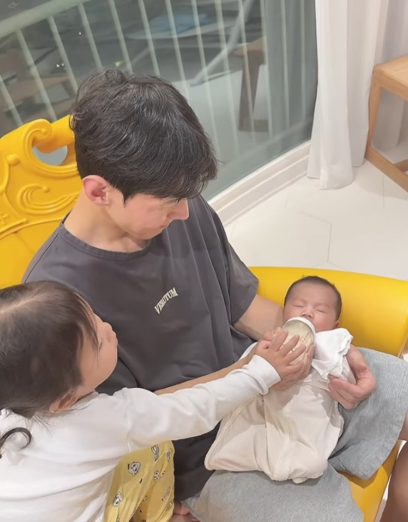 이어 공개된 사진과 영상에는 남편 송재희와 첫째 딸 하엘의 모습도 담겼다. 송재희는 소파에 앉아 아기에게 수유를 하고 있다. 하엘도 함께 젖병을 잡고 아빠의 육아를 돕고 있어 눈길을 끈다.