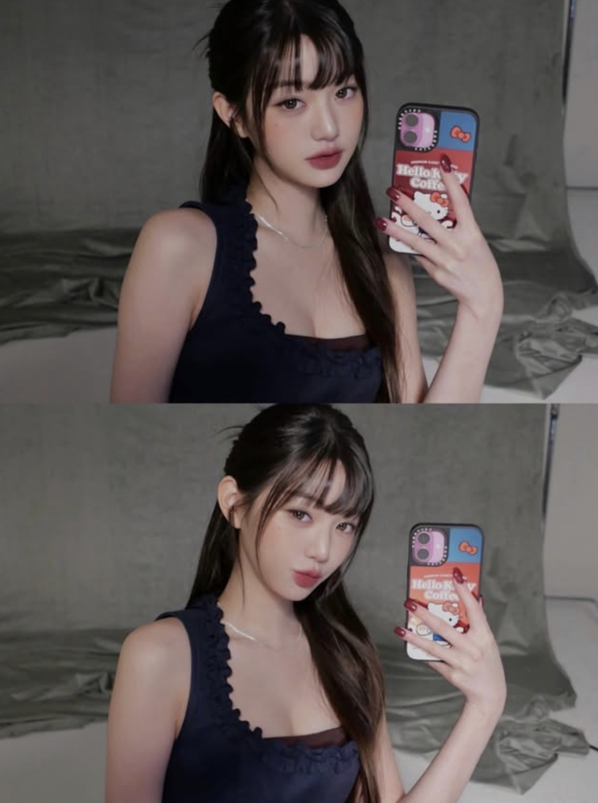또 다른 사진에서는 2분할 컷으로 구성된 셀카를 공개했다. 그는 휴대폰 케이스를 손에 들고 마치 거울 셀카를 찍는 듯한 포즈를 취하며 특유의 청순함과 도도한 분위기를 동시에 자아냈다.