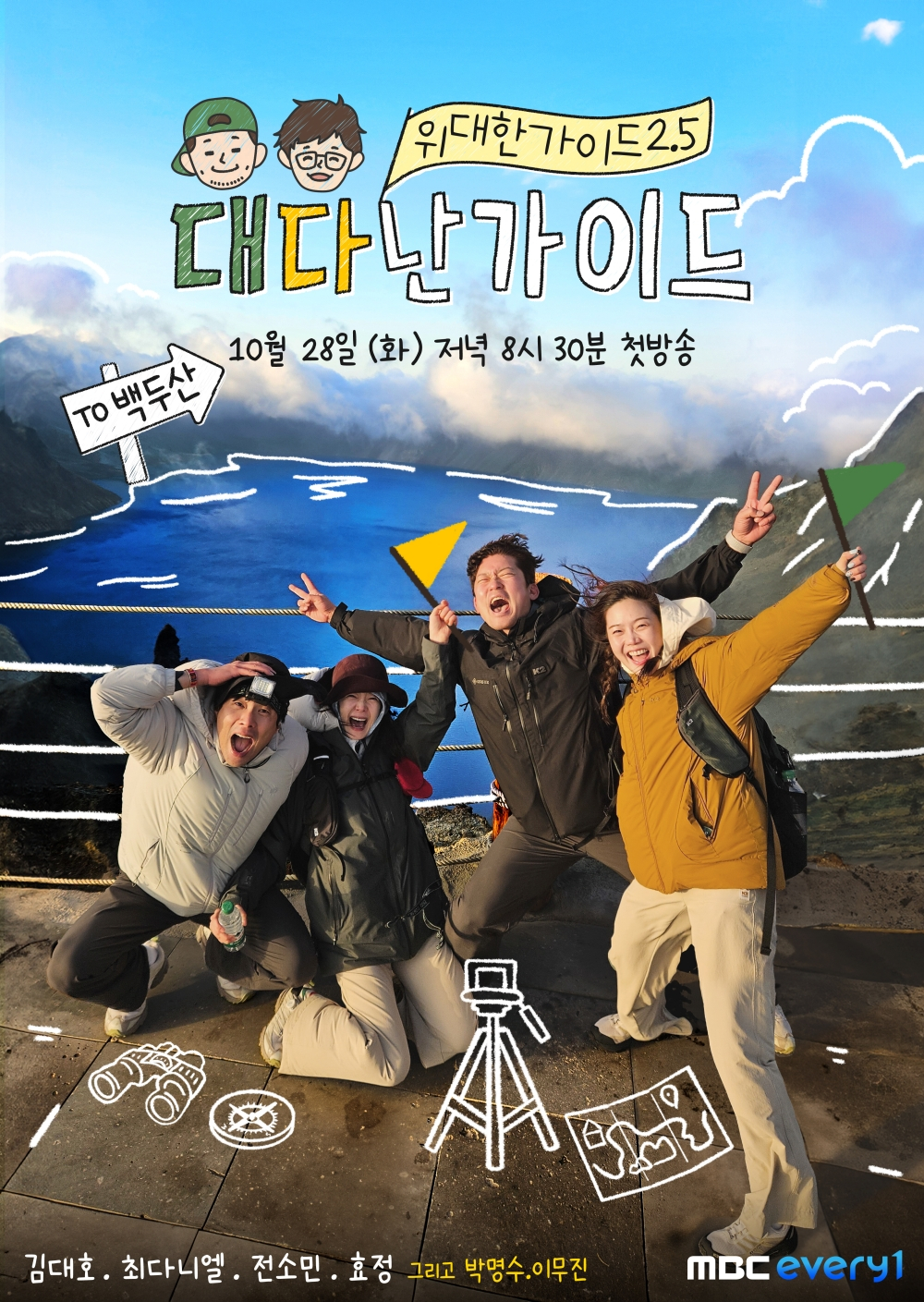MBC에브리원 새 예능 '위대한 가이드2.5-대다난 가이드'는 인기 여행 리얼리티 '위대한 가이드' 시리즈 중 하나로 '위대한 가이드3'로 먼 여정을 떠나기 전 시청자도 쉽게 따라 할 수 있는 유쾌한 여행기를 선보인다. 방송인 김대호, 최다니엘, 전소민, 효정(오마이걸)이 첫 번째 여행지 민족의 영산 백두산으로 여행을 예고해 관심을 모으고 있다.