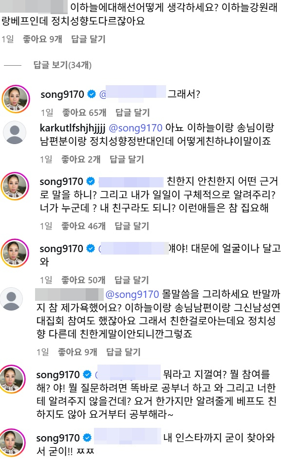 이에 김송은 "그래서?"라고 황당함을 표했고, 네티즌 A 씨는 "아뇨. 이하늘이랑 김송 남편분이랑 정치 성향 정반대인데 어떻게 친하냐 이 말이죠"라고 거듭 물었다.