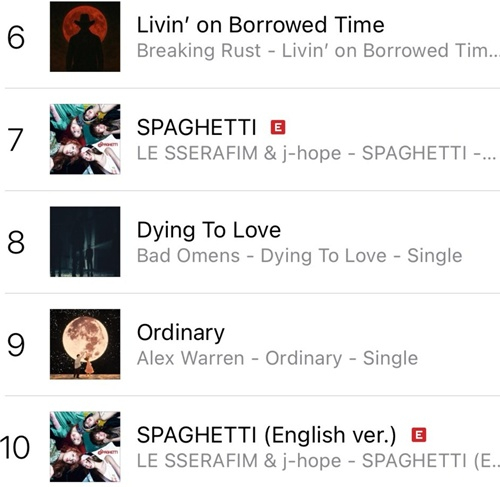 미국 아이튠즈 차트에 두버전 모두 톱10 진입한 르세라핌 '스파게티'