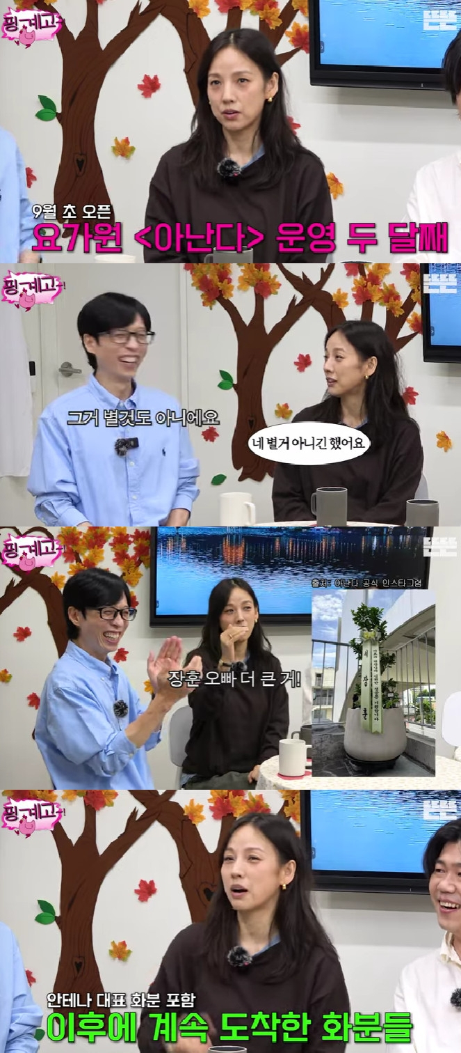 이날 유재석은 이효리에게 "원장님 (요가원) 개업한 지 한두 달 됐냐"라고 물었고, 이효리는 "개업 축하 화분을 보내주셔서 감사하다. 어찌나 응원이 됐는지 모른다. 그때까지는 좋았다. 제가 화분을 인스타그램에 괜히 올린 것 같다. '재석이 거보다 큰 걸로 보내'라고 해가지고, (서) 장훈이 오빠, (유) 희열이 오빠가 제일 큰 걸 보내서 요가원을 꽉 채울 정도로 화분이 왔다"고 밝혔다. 이에 유재석은 "요가원이 거의 아마존이 됐다"고 덧붙여 웃음을 안겼다.