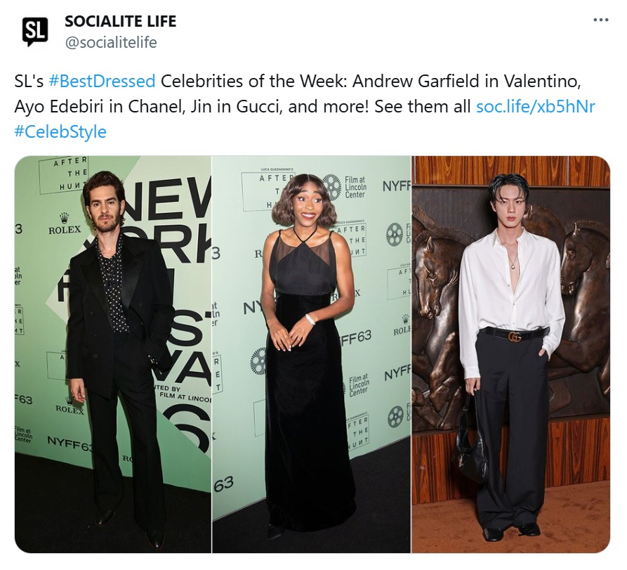 미국 소셜라이트 라이프(SOCIALITE LIFE)는 이주의 베스트 드레서 셀러브리티에 발렌티노의 앤드류 가필드, 샤넬의 아오 에데비리, 구찌의 진을 선정했다.