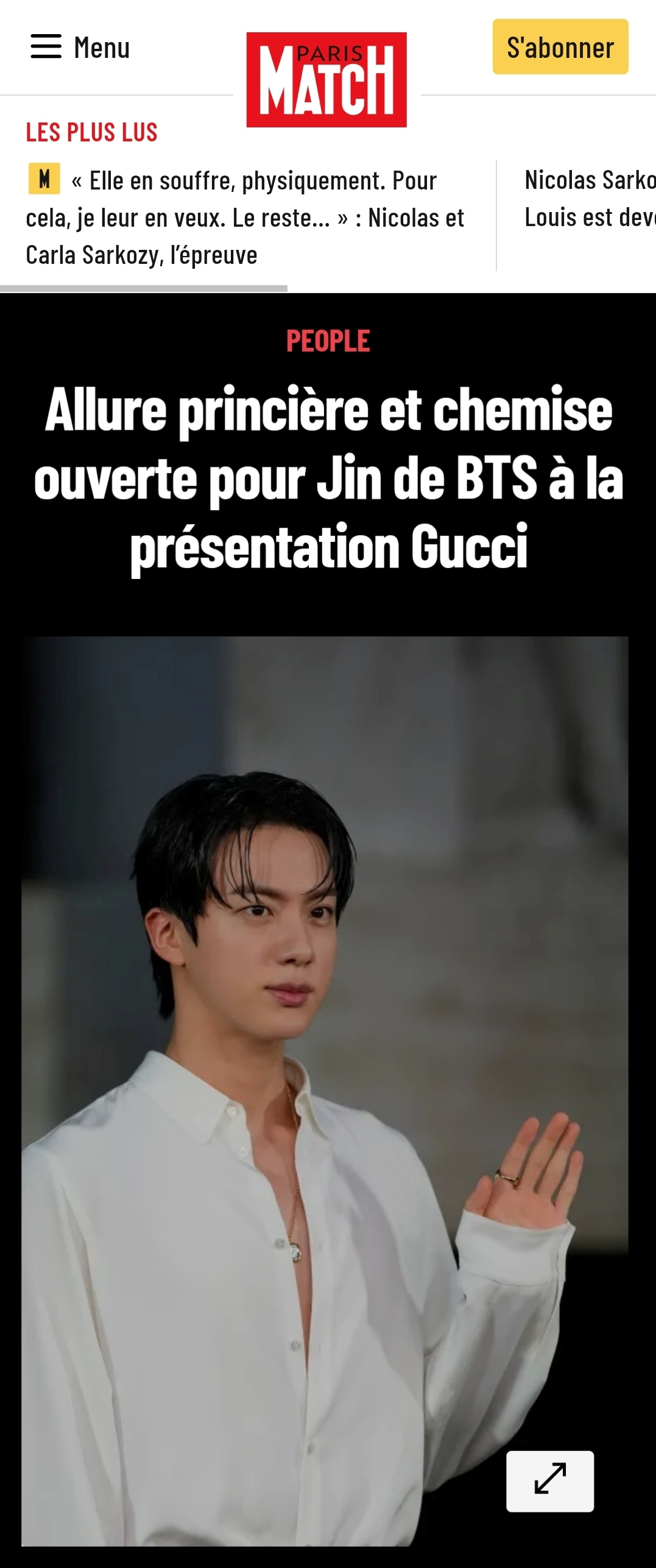 프랑스 최고 주간지 파리 마치(Paris Match)는 '구찌 프리젠테이션에서 왕자의 매력과 오픈 셔츠로 시선 집중시킨 진'이라는 기사를 통해 글로벌 슈퍼스타 진을 집중조명했다.