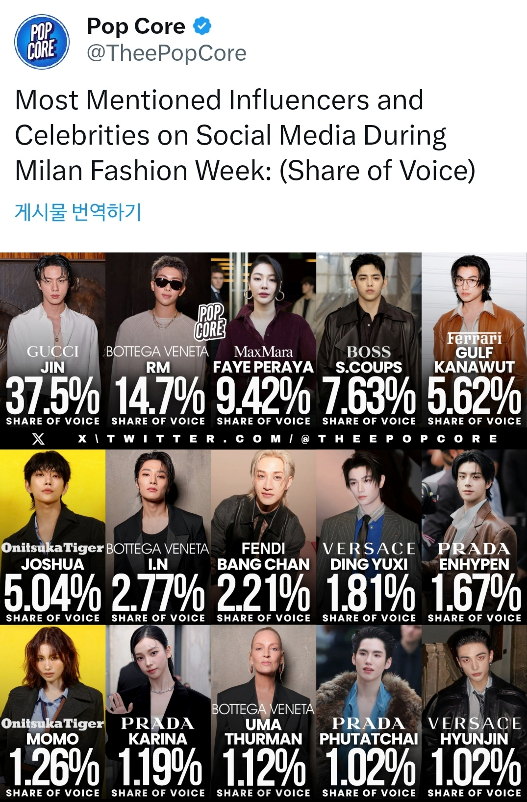 진은 구찌쇼뿐만이 아니라 밀라노 패션 위크의 성공을 견인한 메인 캐릭터이자 글로벌 아이콘으로서 독보적인 인기와 화제성, 영향력으로 전 세계의 주목을 받았다.