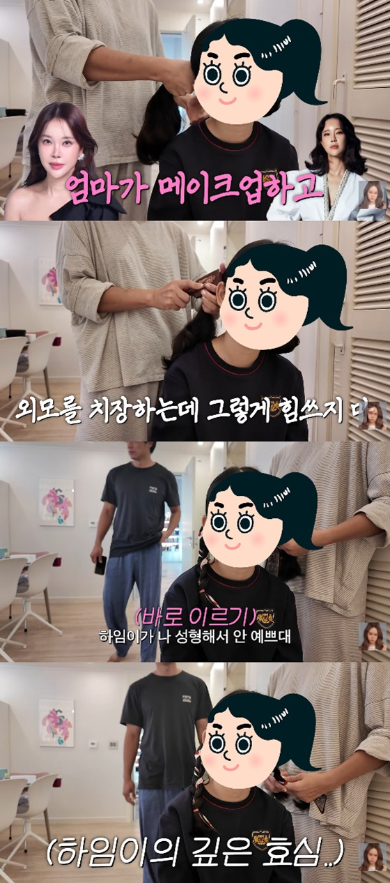 그러자 하임 양은 "내가 빨리 예뻐지면 안 그럴 수 있겠다"며 "카메라 나오는 얼굴보다 실물이 더 나은 거 같다. 엄마는 그냥 둘 다 아니다. 엄마는 성형수술 하지 않았냐"고 말했다.