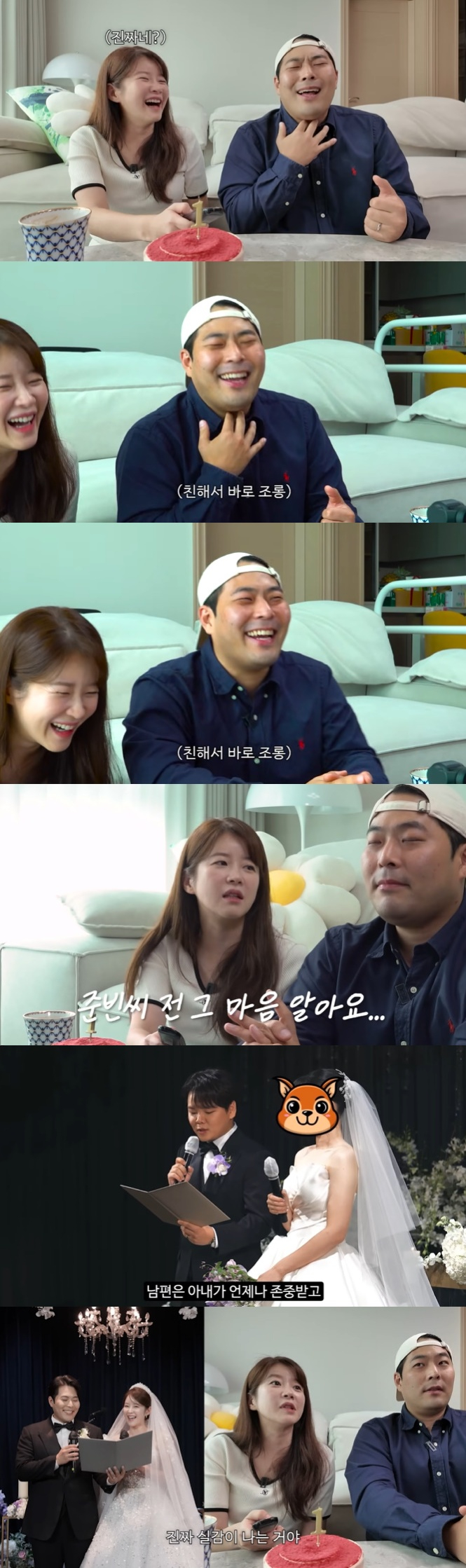 영상 속 김승혜와 김해준은 지난해 결혼식 때의 사진을 다시 보는 시간을 가졌다. 이 가운데 두 사람의 혼인서약 사진이 나오자 김승혜는 "이때 진짜 결혼하는 거구나 실감이 났다. '오빠의 신부가 되겠습니다'라고 할 때 목이 매였다"라고 했다.