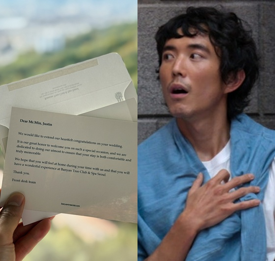 이와 함께 공개한 사진엔 그의 내한 일상과 더불어, 서울 5성급 호텔 측으로부터 받은 '결혼' 축하 편지가 포함됐다. 호텔 측은 '저스틴 민에게, 결혼을 진심으로 축하드립니다. 특별한 기회에 여러분을 맞이하게 되어 큰 영광이다'라는 메시지를 보냈다.