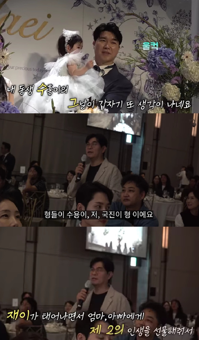 그는 "재이가 태어났을 때 그 누구보다 가장 울컥했던 사람이 수용이, 저, (김) 국진이 형"이라며 감자골 4인방의 우정을 전했다. 그러면서 "재이가 태어나면서 엄마, 아빠에게 제2의 인생을 선물해줘서 다시 한번 고맙고 사랑한다는 말 드리고 싶다"고 말했고, 박수홍 또한 울컥했다.