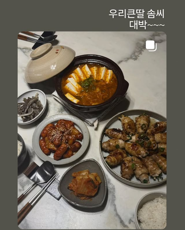 해당 게시물에는 신애라 딸의 요리가 담겨있다. 신애라의 큰딸은 김치찌개와 삼겹살롤, 소시지 야채볶음 등이 놓인 푸짐한 한 상을 공개했고, 그의 놀라운 요리 실력이 감탄을 자아낸다.