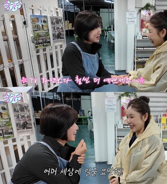 송가인은 사과 따기에 앞서 강습 시간을 가졌다. 강습을 맡은 여성은 송가인의 실물을 보며 깜짝 놀라워했다. 그는 "TV 화면보다 훨씬 더 예쁘시다. 어머, 세상에. 얼굴 요만해"라고 말했다.