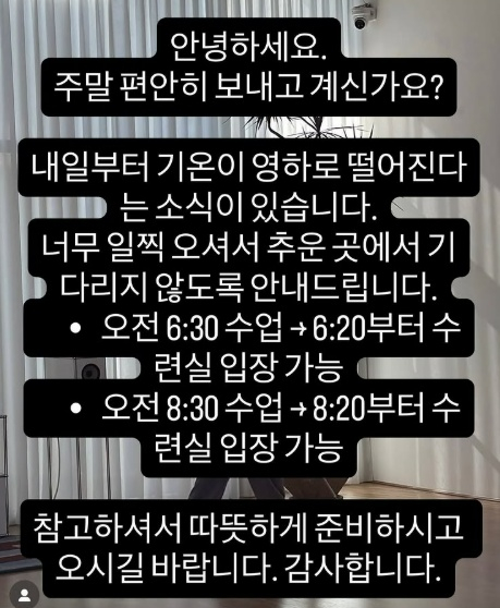 앞서 아난다는 26일 "내일부터 기온이 영하로 떨어진다는 소식이 있습니다. 너무 일찍 오셔서 추운 곳에서 기다리지 않도록 안내드립니다. 오전 6:30 수업 → 6:20부터 수련실 입장 가능. 오전 8:30 수업 → 8:20부터 수련실 입장 가능. 참고하셔서 따뜻하게 준비하시고 오시길 바랍니다. 감사합니다"라고 전했다.