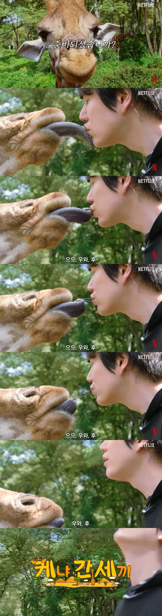 어째서인지 규현이 기린의 먹이를 입에 문 채 가까이 다가갔다. 이를 기린이 긴 혓바닥으로 받아먹으면서, 규현의 입술이 기린의 침으로 범벅되는 아찔한 순간이 카메라에 적나라하게 포착됐다.