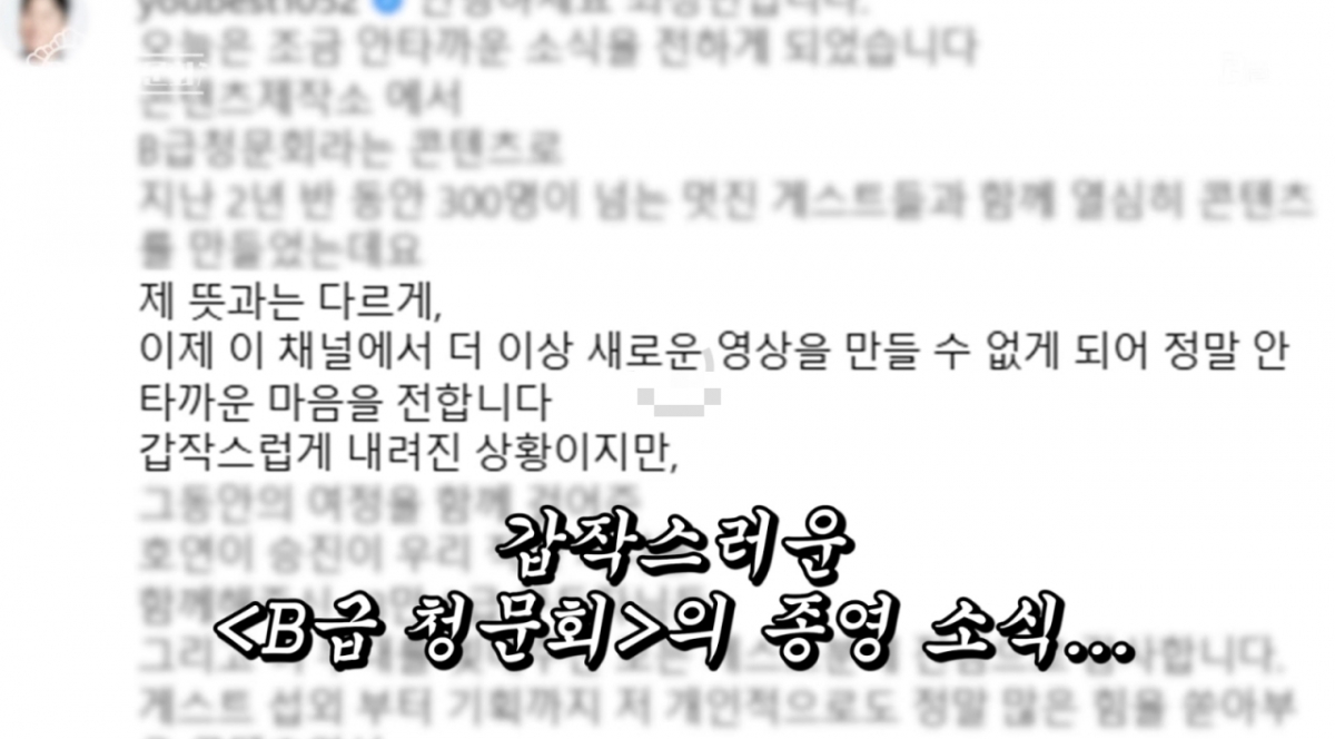 공개된 영상에는 지난 8월 최성민이 자신의 계정을 통해 'B급 청문회'의 종영 소식을 전했던 내용이 담겼다.