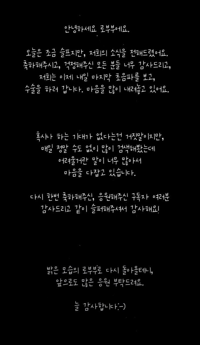 27일 유튜브 채널 '로부부'에는 '로부부 심장소리 확인하러 간 날. 그리고, 안녕'이란 제목으로 영상이 올라왔다.
