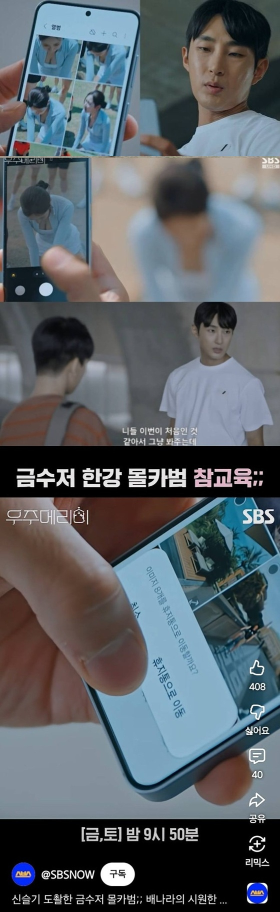 앞서 25일 방송된 SBS 금토드라마 '우주메리미'(극본 이하나/연출 송현욱·황인혁) 6회에선 불법촬영 범죄 소재를 서브 캐릭터 백상현(배나라 분)-가정의학과 전문의 윤진경(신슬기 분)의 러브라인 점화를 위한 매개체로 쓰는 황당한 전개가 펼쳐졌다.