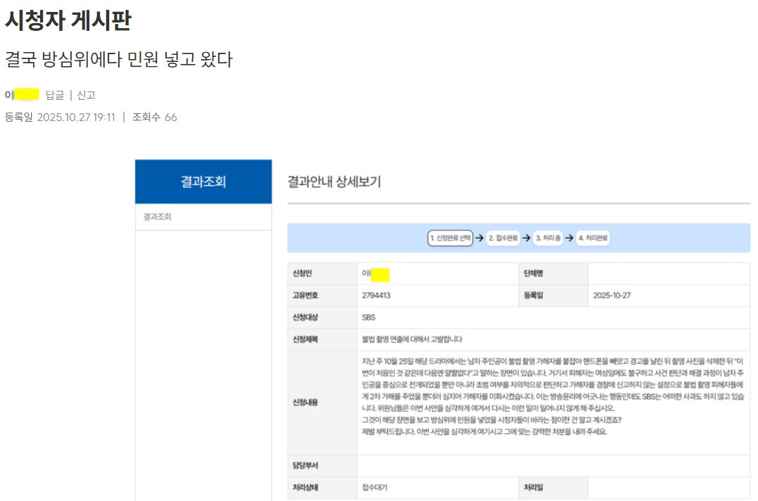 작성자가 공개한 캡처 사진에 따르면 그는 방심위에 SBS를 대상으로 '불법촬영 연출에 대해 고발한다'라는 제목의 민원을 제기했다.