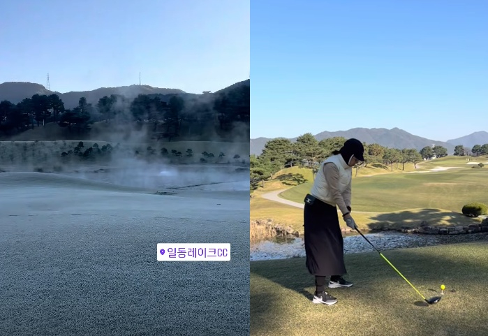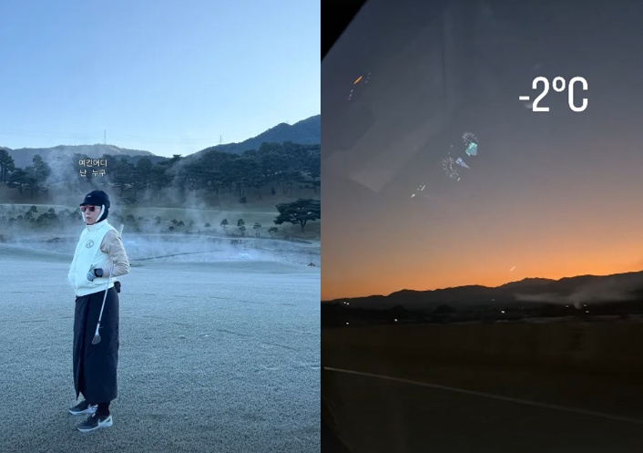 사진과 영상 속 김지혜는 영하 2도에 다다른 추위에 무장한 채로 골프 라운딩에 나서고 있다.