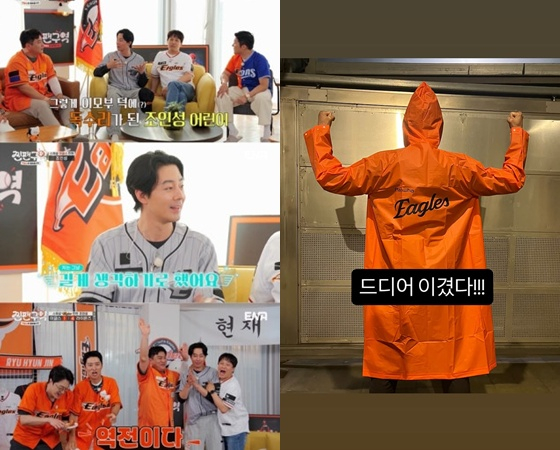사진 속에는 조인성이 오렌지색 한화 공식 우비를 입고 만세를 하고 있는 모습이 담겨 있었다. 그는 뒤로 돌아 '이글스' 문구가 돋보이게 만들었다.