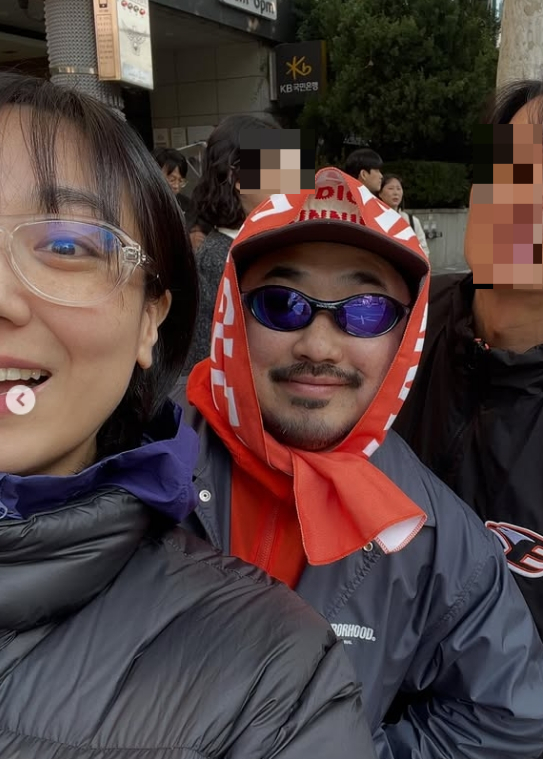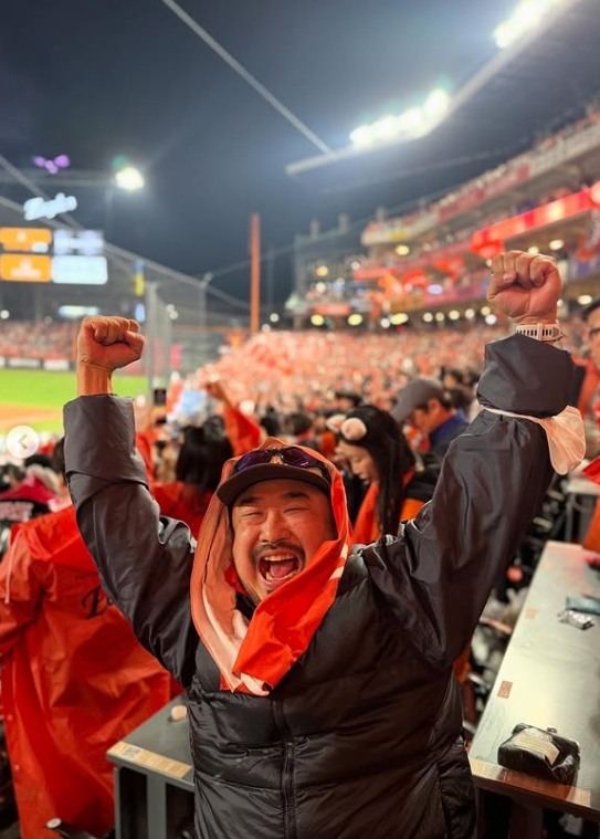 사진 속 강재준은 야구장에서 한화 이글스 응원 머플러를 얼굴에 두르고 두 주먹을 불끈 쥔 채 두 팔을 들어 올리며 환호하고 있다. 함께 경기를 즐긴 아내 이은형의 모습도 눈길을 끈다.