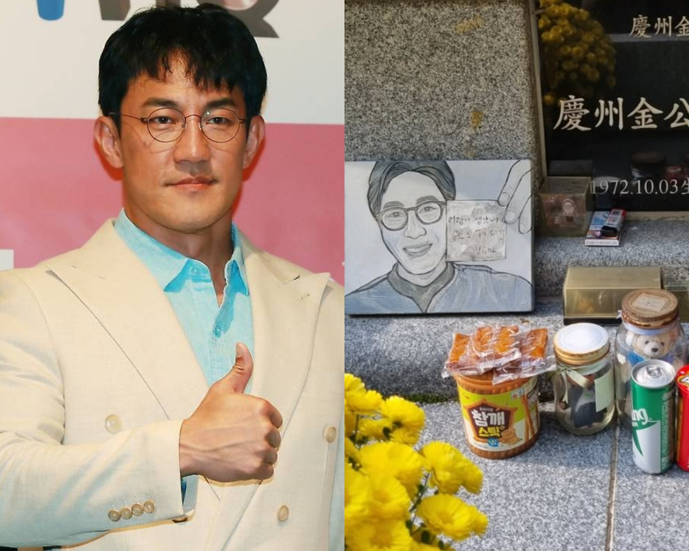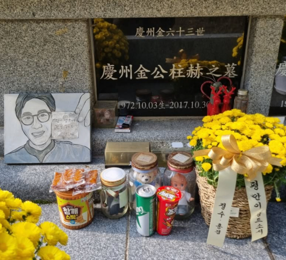 공개된 사진에는 고 김주혁의 묘소가 담겼다. 고인을 그린 그림과 여러 먹거리, 꽃 바구니, 장난감 등이 가득한 모습이다.