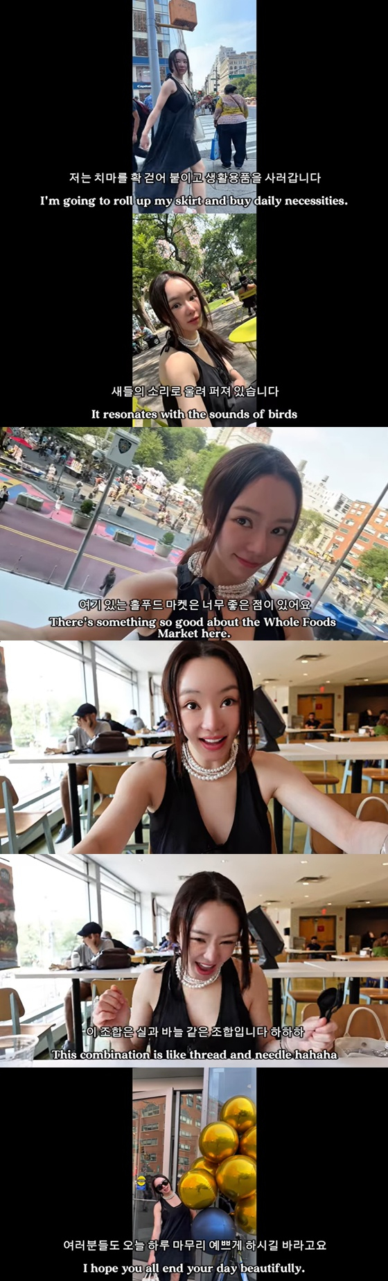 그러면서 서우는 "할머니가 돼 가고 있는 서우야. 마음껏 먹어. 인생 뭐 있어? 이렇게 아름다운 뉴욕에서 장 보고 산책도 하고 밥도 먹고, 이렇게 하루하루 사는 거지. 가만히 앉아서 보고만 있어도 재밌고 신기한 뉴욕에서의 제 모습을 보고 같이 힐링하시면 좋겠다. 크게 다를 거 없고 평범한 제 하루이지만, 바비큐 샐러드 하나에 세상에서 제일 행복했다. 걷다 보면 아름다운 거리만 펼쳐지는 곳, 뉴욕에서 하루를 보내고 있는 서우였습니다"라고 '소확행'(소소하지만 확실한 행복)을 강조했다.