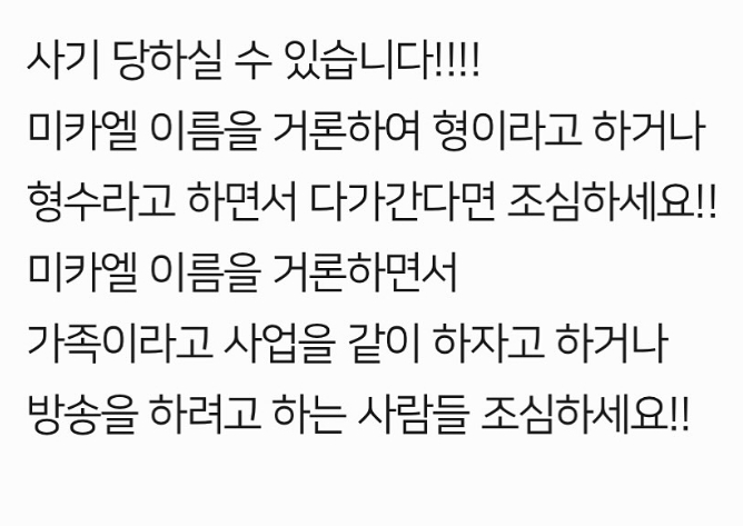 미카엘 셰프는 3일 "미카엘을 거론하여 사업이나 방송을 하려는 사람들 조심하세요!! 이 사람들은 전 세계적으로 미카엘 셰프를 이용하여 가족이라거나 형, 형수라고 하면서 다가가면 조심하세요!! 확인이 필요하면 DM 주세요"라고 밝혔다.