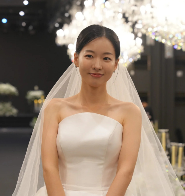 배우 이시아가 웨딩 드레스를 입고 단아한 미소를 지었다.