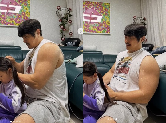 공개된 사진 속 KCM은 근육이 빵빵한 팔로 딸의 머리카락을 묶어주고 있다. 다정한 아빠의 모습이 시선을 사로잡는다.