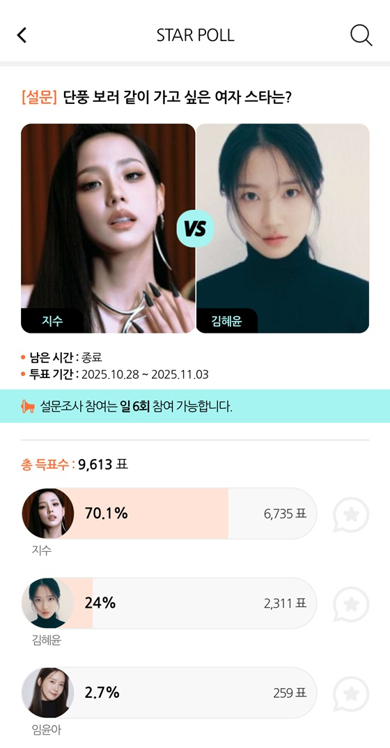 지수는 10월 28일부터 11월 3일까지 종합 엔터테인먼트 모바일 앱 스타폴(STARPOLL)에서 진행된 '단풍 보러 같이 가고 싶은 여자 스타는?' 설문에서 1위에 올랐다.