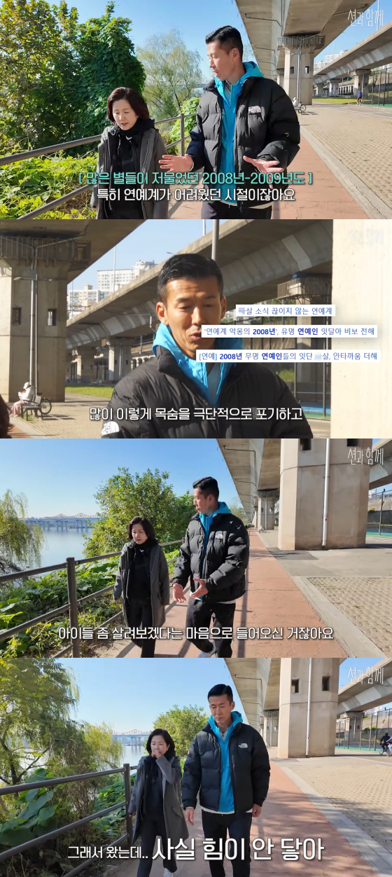 이날 션은 이성미와 산책하던 중 "누님이 캐나다에서 생활하다가 한국에 들어오셨던 때가 연예계가 특히 어려웠던 때 아니냐"고 말했다.