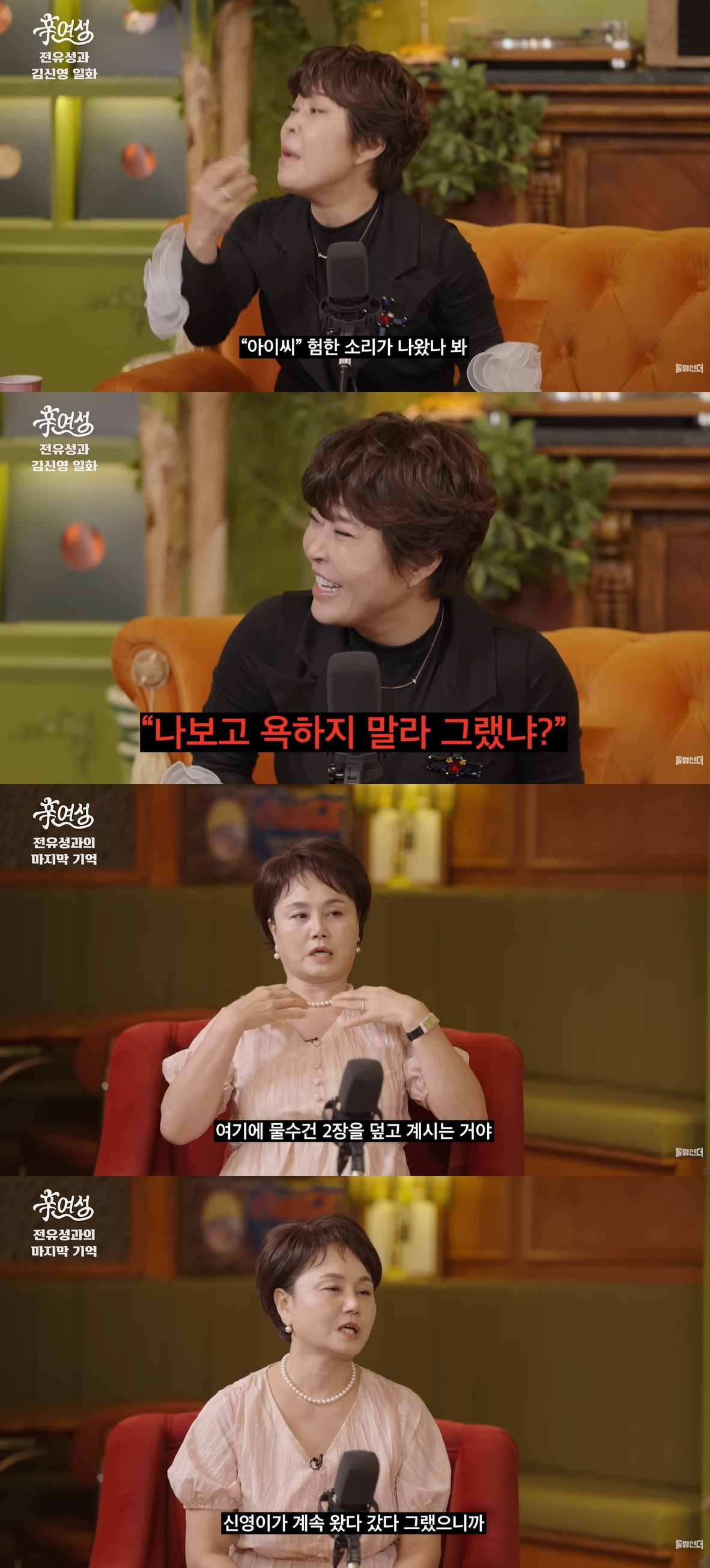 이날 조혜련은 김신영이 대학생 시절 고 전유성과 함께했던 에피소드를 밝혔다. 그는 "(김) 신영이가 운전할 때 유성이 오빠한테 '사람들을 너무 챙기지 말라'고 잔소리하는데 누가 끼어들었다. 그래서 '에이'라면서 험한 말을 했다고 했다"라며 "유성 오빠가 '사람들한테 험한 소리 하지 마라'고 했는데, 또 끼어드니까 유성이 오빠가 '이런 XX'했다더라"고 말해 웃음을 자아냈다.