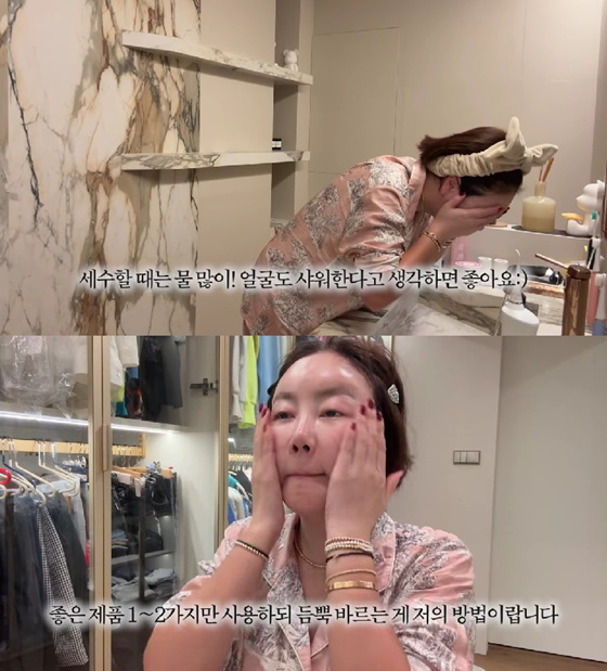 세안 후 그는 기초 화장품을 발랐다. 50대라는 나이가 무색할만큼 탱탱한 피부를 자랑했다. 그는 '좋은 제품 1~2가지만 사용하되 듬뿍 바르는 게 제 방법'이라고 설명했다.
