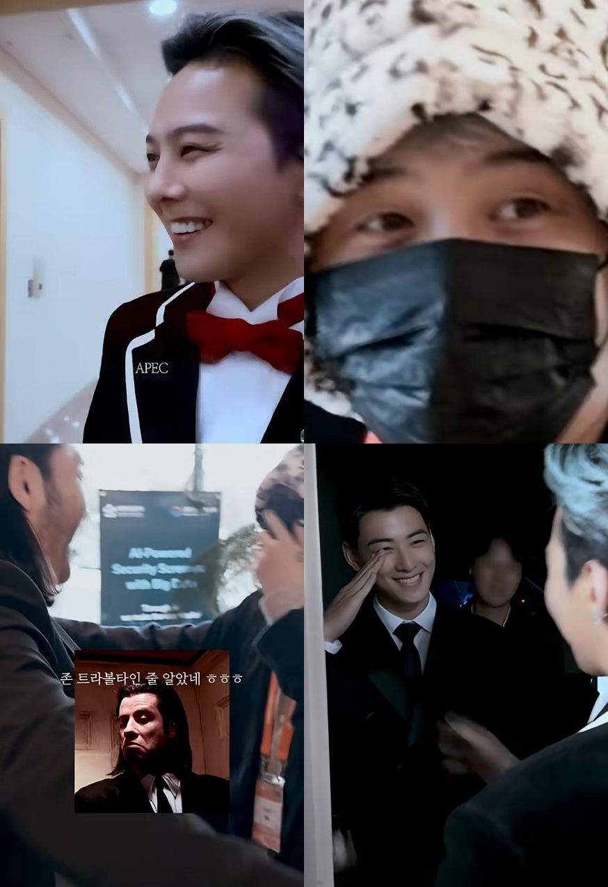 이어 APEC 정상회의 환영 만찬에 사회자로 등장한 군인 차은우와도 만났다. 차은우는 "충성"이라고 반갑게 경례하며 미소 지었고, 지드래곤과 포옹을 나눴다.