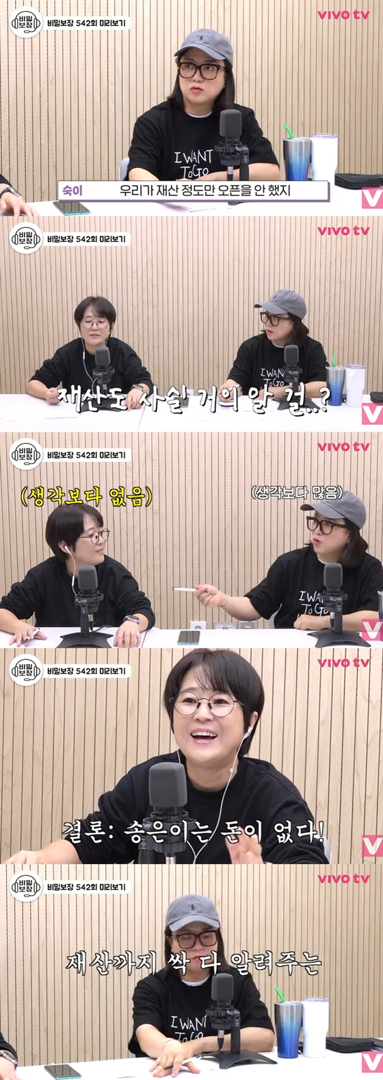 이어 "우리가 재산 정도만 오픈을 안 하고 어지간한 건 다 오픈했다"고 덧붙였다. 이를 들은 송은이는 "재산도 사실 이제 거의 알지 않겠냐"고 말했다.