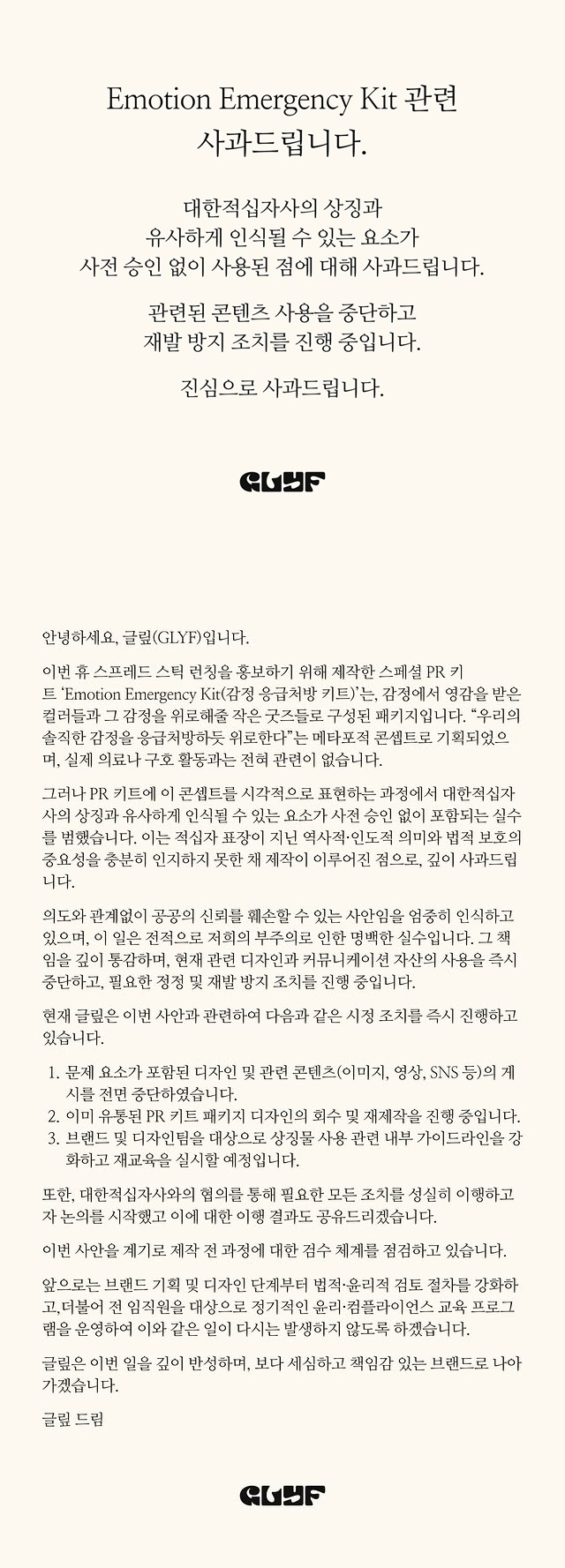글맆 측은 "이는 적십자 표장이 지닌 역사적, 인도적 의미와 법적 보호의 중요성을 충분히 인지하지 못한 채 제작이 이루어진 점으로 깊이 사과드린다. 의도와 관계 없이 공공의 신뢰를 훼손할 수 있는 사안임을 엄중히 인식하고 있으며, 이 일은 전적으로 저희의 부주의로 인한 명백한 실수이다. 그 책임을 깊이 통감하며, 현재 관련 디자인과 커뮤니케이션 자산의 사용을 즉시 중단하고, 필요한 정정 및 재발 방지 조치를 진행 중"이라고 전했다.