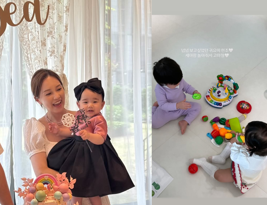 공개된 사진 속에는 장난감을 가지고 함께 놀고 있는 아유미의 딸과 강재준, 이은형 부부 아들의 모습이 담겼다. 2개월 차이 동갑인 두 아이의 귀여운 모습이 미소를 안긴다.