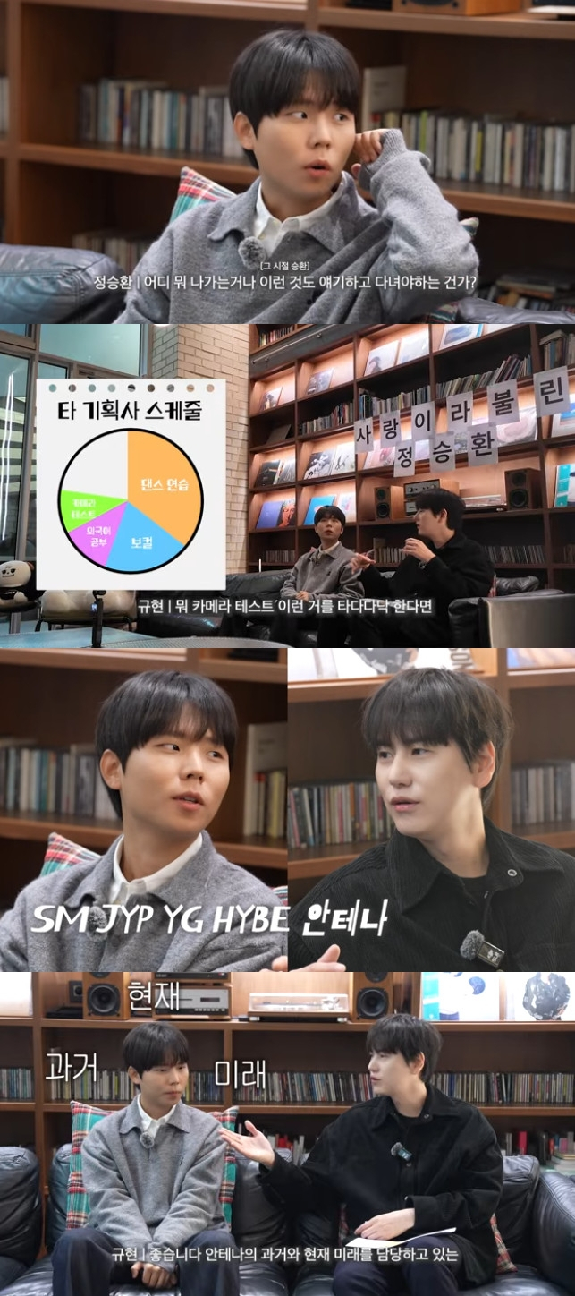 7일 유튜브 채널 '규현'에는 '안테나 사옥 습격! 원투펀치 출격으로 바쁜 엔터사의 현재 (with 정승환)'라는 제목의 영상이 공개됐다.