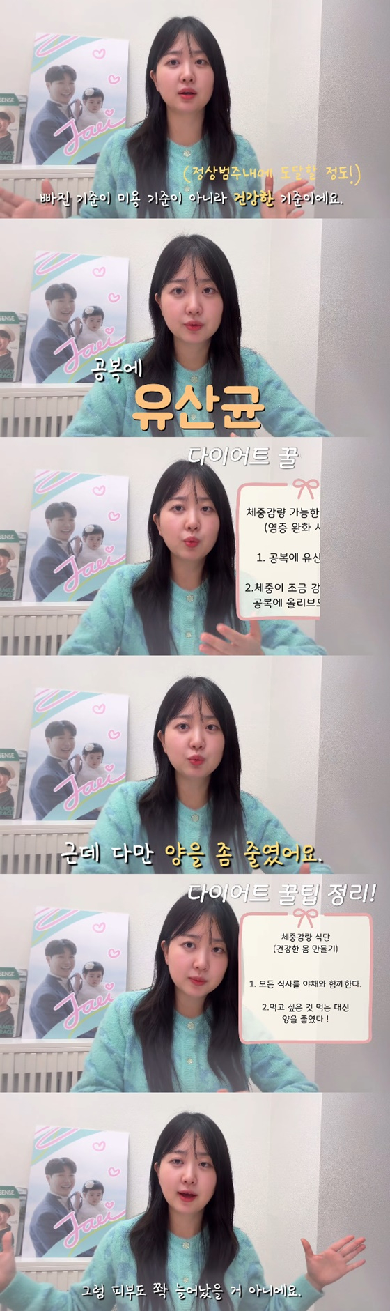 이어 "정말 (건강이) 안 좋았을 때 대장에 염증이 보였다"며 "염증 수치가 높았던 이유도 장내 환경이 안 좋아서다. 장내 환경이 안 좋으면 면역력 떨어지니까 배변 활동도 원활하지 않았다. 그래서 초기에는 6알씩 먹었다. 다양한 배양균을 섭취하기 위해 여러 개 먹었고, 지금은 3알 먹고 있다"고 덧붙였다.
