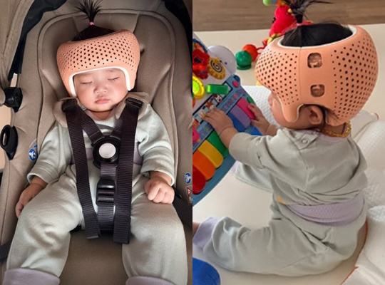 이어 손담비는 유모차에서 헬멧을 쓰고 잠든 딸의 모습 위로 "헬멧 써도 귀여워"라고 올렸다. 해당 헬멧은 아기의 두상을 어린 시절 교정하기 위해 착용하는 헬멧이다.