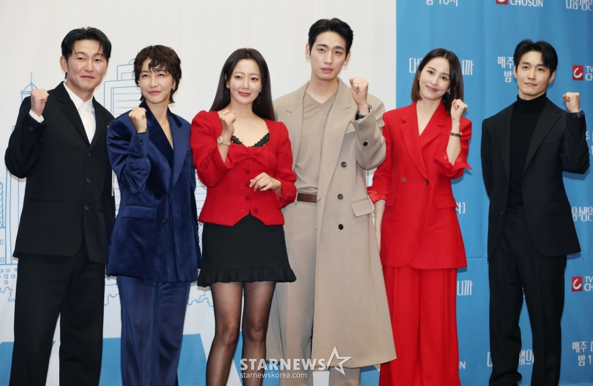 배우 허준석, 진서연, 김희선, 윤박, 한혜진, 장인섭이 10일 오후 서울 마포구 상암동 스탠포드호텔에서 진행된 TV조선 월화드라마 '다음생은 없으니까' 제작발표회에 참석해 포즈를 취하고 있다.